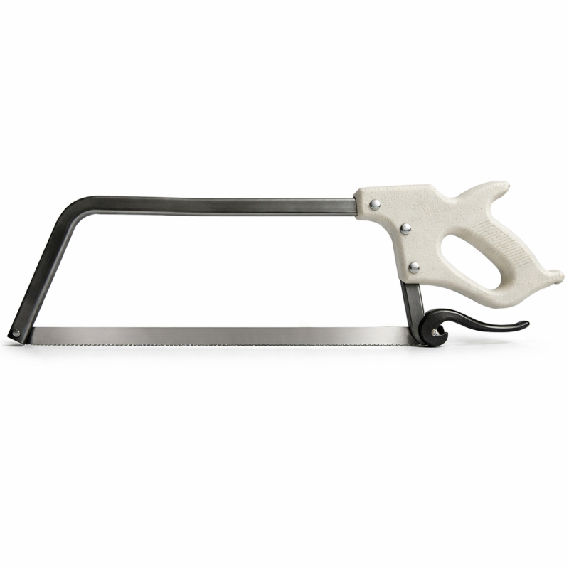 Scie indispensable pour le boucher. Scie à main de type "Américaine" manche plastique, vis alu, structure en inox et lame US fine permettant une découpe nette et précise.
