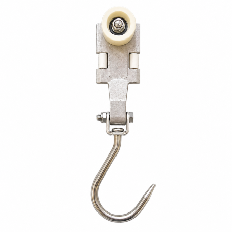 Crochet bi-rail long conçu pour les installations d’abattoirs et lignes de convoyage industrielles. Équipé d’un galet de guidage, il permet un déplacement fluide et sécurisé sur rail tout en assurant une excellente stabilité de charge.