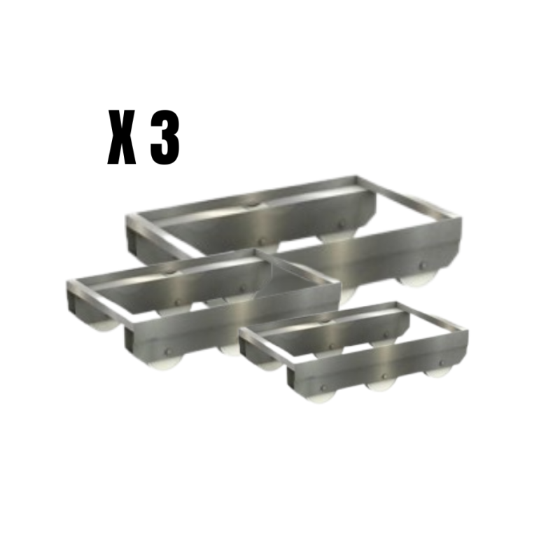 Chariot en inox permettant le déplacement de bacs dans les laboratoirs. Maniable grâce à ses roues centrales. Très solide. Dimension des bacs 400 x 600 mm.